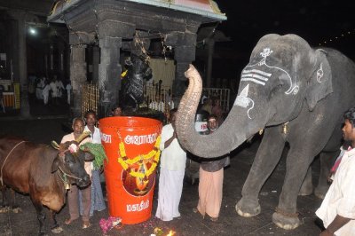 pot, with Rukku, the Temple elephant and a cow from the Temple goshala,