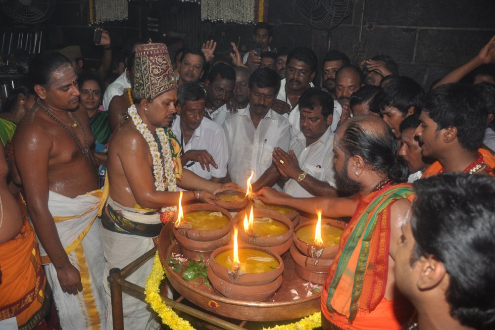 The chief priest has just finished a simple ritual called bharani deepam