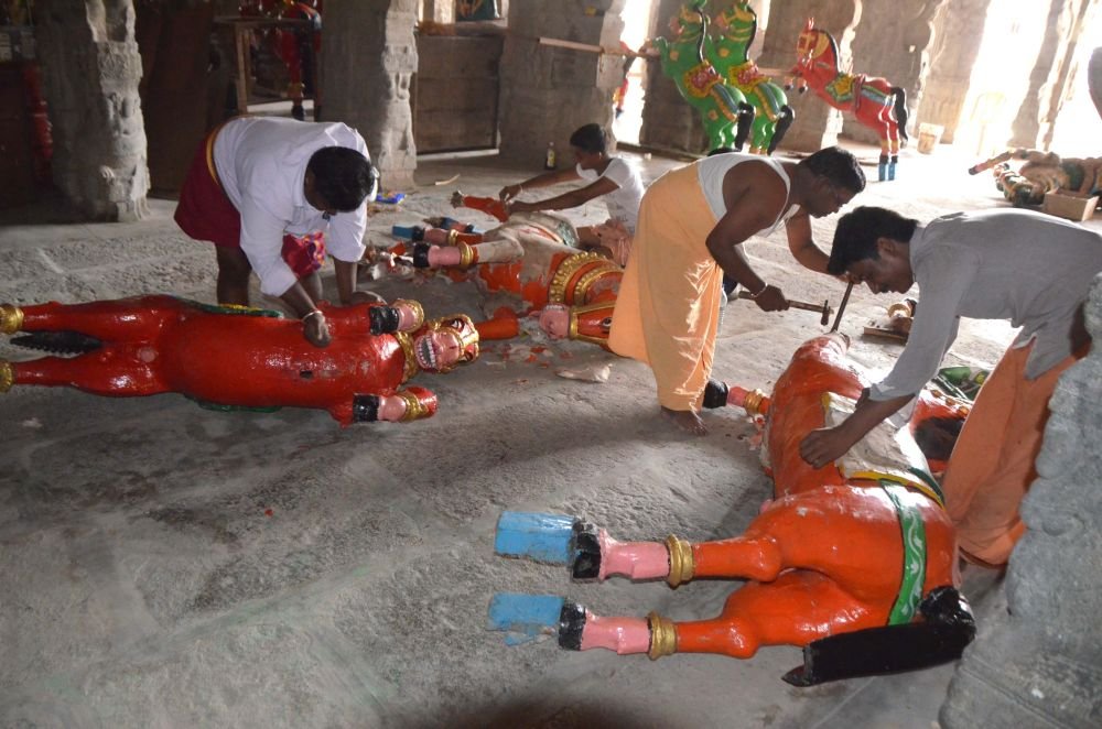 Photographs below of the Vahanas being repaired and painted in time for the 2016 Mahadeepam Festival.
